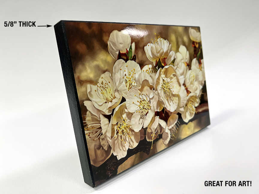 These wood prints are created on 5/8” thick MDF panels offering a beautiful high gloss finish.
